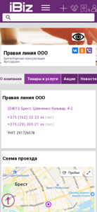 | AI-анализ | The web project " Правая линия ООО" is a business consulting firm specializing in accounting services and outsourcing located in Brest, Belarus. The company's address is Шевченко бульвар, 4-2, and it can be reached via the phone numbers +375 (162) 32 23 xx or +375 (29) 305 21 xx. The business hours are from 9:00 to 18:00, Monday through Friday, with Saturdays and Sundays being closed. The company offers buhgalterskie uslugi (accounting services) and auditing, as well as various other business-related services. The website provides a scheme for reaching the company's location, as well as conditions of use and contact information. |