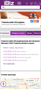| AI-анализ | This website is for the Gomeльsky Obedinennyy Avtovokzal Filial OAO Goмельоблавтотранс, a passenger transportation organization located in Goмель, Belarus. The website provides a bus schedule, contact information, and address for the bus station at 246022, Kurchatova Street, 1. The site also includes information on how to reach the station. Users can create their own map, check traffic conditions, and view statistics. The station's opening hours are from Monday to Friday, 9:00 to 18:00, with no breaks for lunch. The contact numbers provided are for inquiries, the station's duty officer, the dispatcher, and the reception desk. The company is listed under the categories of "Autovokzaly" (bus stations) and "Gomel" |