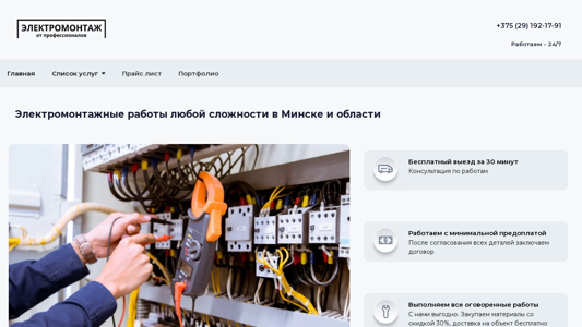 | SEO-описание | Вызов электрика на дом, выезд мастера в офис. Электромонтажные работы Минск и Минская область, под ключ недорого, с гарантией. |