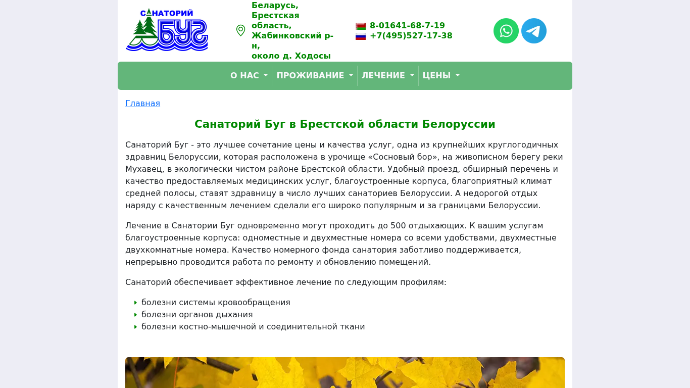| SEO-описание | Санаторий Буг - это лучшее сочетание цены и качества услуг, одна из крупнейших круглогодичных здравниц Белоруссии, которая расположена в урочище «Сосновый бор», на живописном берегу реки Мухавец, в экологически чистом районе Брестской области. |