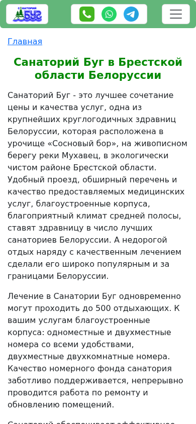 | AI-анализ | The website is the official site of Sanatorium Bug, a large, year-round health resort located in the Soсновый Бор area of the Brest Region in Belarus. Set on the picturesque banks of the Muhavets River in an ecologically clean area, the sanatorium offers a combination of affordability and high-quality services, making it one of the most popular health resorts in Belarus. The resort is easily accessible and provides a wide range of medical services, comfortable accommodations, and various amenities. Sanatorium Bug specializes in the treatment of cardiovascular, respiratory, and musculoskeletal diseases, and can accommodate up to 500 guests at a time. The resort features well-maintained single and double rooms, as well as two-bedroom apartments, all equipped with modern comforts. The sanatorium's extensive |