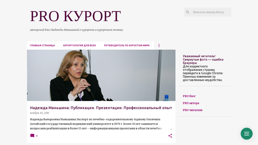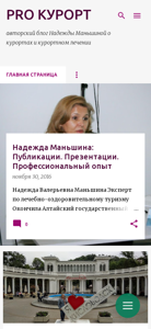| AI-анализ | This online resource, titled "PRO КУРОРТ," is an author blog by Nadezhda Mangishina about resorts and spa treatments. The website provides information on various resorts and their therapeutic benefits. The blog includes sections such as "КУРОРТОЛОГИЯ ДЛЯ ВСЕХ ПУТЕВОДИТЕЛЬ ПО КУРОРТАМ МИРА" and features articles, presentations, and professional experience in the field of therapeutic tourism. The author, Nadezhda Mangishina, is an expert in rehabilitation and has been involved in informational projects related to therapeutic tourism for over 15 years. She has authored several books, including "Курортология для всех" and "Путеводитель |