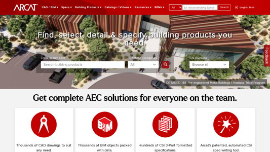 | AI-анализ | This website is a Building Information Modeling (BIM) solutions company called Arcat. It provides architectural information on various building materials, manufacturers, specifications, BIM families, and CAD drawings. Keywords related to this website include building material directory, specs, specifications, data sheets, CAD drawings, CAD details, dwg files, building materials, construction products, product catalog, information, manufacturers, architect, contractor, engineer, builder, sitework, concrete, cement, masonry, metals, plastics, wood, thermal, moisture protection, doors, windows, furnishings, special construction, finishes, construction equipment. The website includes features such as SpecWizard for short form specifications, outlines for detailed specifications, product catalogs, videos, and webinars. It offers resources for architects, contractors, engineers, and builders, as well as information |