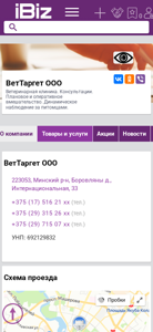 | AI-анализ | This website is a veterinary clinic named ВетТаргет ООО, located at 223053, , Боровляны д., Интернаacionalnaya, 33 in Minsk region, Belarus. The clinic offers consultations, planned and operational intervention, and dynamic monitoring of pets. The website provides contact information including phone numbers, +375 (17) 516 21 xx, +375 (29) 315 26 xx, and +375 (29) 715 07 xx. The company's UNP number is 692129832. The website includes sections for company information, products and services, veterinary services, and animal care, as well as news, announcements, vacancies, videos, and customer reviews. |