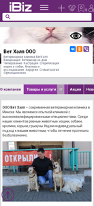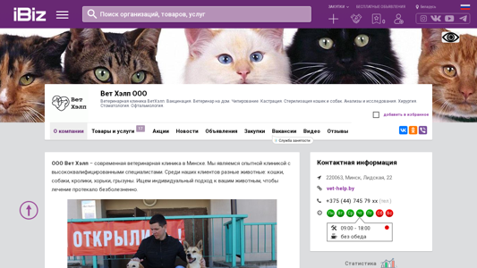 | AI-анализ | --- This website is for Vet Help OOO, a veterinary clinic in Minsk, Belarus. Services offered include veterinary consultation, vaccination, home visit by a vet, chipping, sterilization, castration for cats and dogs, analyses and research, surgery, and dental and eye care. The company is located at 220063, Lidskaya, 22. Contact information includes a phone number +375 (44) 745 79 xx and business hours from Monday to Friday, 9:00 AM to 6:00 PM, with no service during lunch. The clinic is a modern and comfortable facility with a friendly and responsive staff, offering various veterinary services for cats, dogs, rabbits, ferrets, and other small animals. The clinic aims to provide individualized care to ensure painless treatment for |