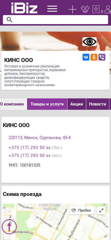 | Название / Заголовок | КИНС ООО - Оптовая и розничная реализация ветеринарных препаратов, кормовых добавок, биопрепаратов, дезинфицирующих средств, сопутствующих товаров зооветеринарного назначения.. 220113, Минск, , Сурганова, 43-4 |