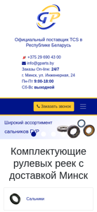 | AI-анализ | The web project gparts.by specializes in the sale of components and complete sets for TCS steering columns. The official supplier of TCS in the Republic of Belarus, the website offers a wide range of products, including steering column parts and accessories, such as rubber rings, hydraulic pumps, and pusher rods. The company boasts quick delivery and consultation services within Belarus, with a phone number for customer inquiries listed on the website. The website also includes information on the location of the business in Minsk and its operating hours. Brands and certificates are also featured on the site. |