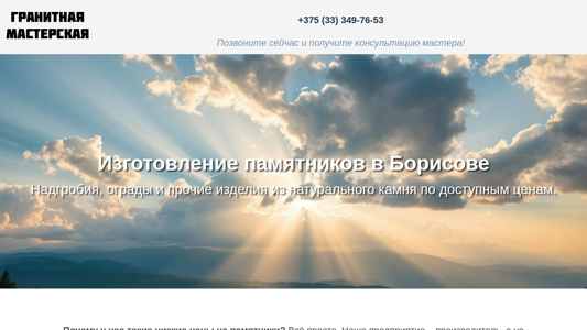 | SEO-описание | Гранитная мастерская в Борисове. Изготовление памятников, оград и прочих изделий из натурального гранита по доступным ценам. |