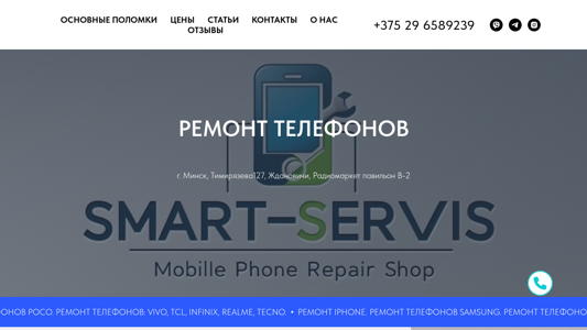 | AI-анализ | The web project 'Smart Servis' is a professional phone repair service based in Minsk, Belarus. It offers quick and high-quality repairs for various brands such as iPhone, Samsung, Xiaomi, and others. The services include screen, battery, connector, and speaker replacements, among others. The repair shop provides a swift diagnosis and offers a guarantee on all repairs. The keywords associated with the website include 'repair phones in Minsk,' 'repair telephones,' 'quick repair,' 'affordable repair,' and specific brand names. The top words in the website are 'repair,' 'telephones,' 'phone,' 'replacement,' 'iPhone,' and 'repair services.' The website provides reasons for choosing them, such as experience and professionalism with over 15 years in phone repair, skilled technicians, and fast repairs with 85% completed within an |