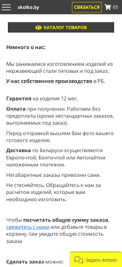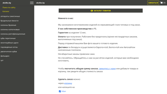| AI-анализ | The portal skolko.by specializes in producing and supplying products made of food-grade stainless steel in Belarus. The company's own manufacturing facility is located in Minsk, Belarus. They offer typical and custom-made items, and guarantee their products for a period of 12 months. Payment is due upon receipt, and they do not require prepayment for standard orders. Prior to shipping, customers will receive a photo of their completed product. Domestic delivery is handled by Europost, Belpost, or Autolaim with prepaid fees. Non-standard orders will be personally delivered. For inquiries about the cost of specific items, customers can contact the company or add items to their cart to view the total order cost. Orders can be placed through the cart or by contacting the company via Viber, Telegram, WhatsApp, email, or phone. The |