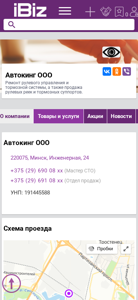 | AI-анализ | This website is an automotive repair and sales company called Автокинг ООО, located in Minsk, Belarus, at the address Инженерная, 24. The company specializes in the repair of steering systems and brake systems, as well as the sale of steering racks and brake supports. Contact information for the master service station and sales department are provided, along with their phone numbers: +375 (29) 690 08 xx and +375 (29) 691 08 xx, respectively. The company's UNP number is 191445588. A map and directions for reaching the location are also available on the website, along with operating hours from Monday to Saturday, 9:00 AM to 6:00 PM, without lunch breaks. The company is |