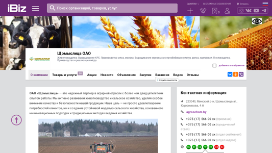 | Название / Заголовок | Щомыслица ОАО - Животноводство. Выращивание КРС. Производство мяса, молока. Выращивание зерновых и зернобобовых культур, рапса, картофеля. Пчеловодство. Производство и реализация мёда.. 223049, , Щомыслица аг., Кирюникова, 4 А |