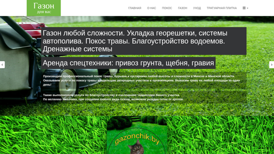 | AI-анализ | The portal Gazonchik.by offers landscaping and improvement services in Minsk. Key services include lawn care, lawn installation, tiling, drainage systems, and rental of specialized equipment for soil and gravel import. The company provides professional lawn care for private landowners and organizations in Minsk and the surrounding area. They promise to mow the lawn on any sized plot in one day. Additional services include landscaping and gardening for the customer's property, with the option to install anti-gopher mesh during the creation of any type of lawn. Quick work, extensive experience, and a high-quality service are emphasized, with affordable prices and a quality guarantee. The comprehensive soil preparation for seeded and rolled lawns includes land leveling, weed removal, surface planning, and the application of fertilizers and grass seed, as well as the use of specialized equipment. The site also mentions spring, |