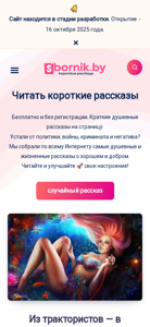 | AI-анализ | --- This website is a collection of short stories titled "Сборник коротких рассказов - читать короткие рассказы" (A Collection of Short Stories - Read Short Stories). The site is under development with an opening date of October 16, 2025. It offers free and registration-free reading of short, spiritual, and uplifting stories about love, relationships, and life. Visitors can read about 8 minutes, 7 minute, and 4 minute long stories, titled "Из трактористов — в фотомодели", "Против ветра", and "Ангел", respectively. Other titles include "Идеальная девушка для мужчины после 40", "Новый год в студенческой общаге…", and "Как изменить мир вокруг |