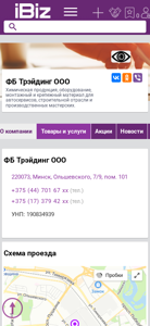 | AI-анализ | This online resource is a business-to-business trading platform for chemical products, equipment, mounting and fastening materials for the automotive service industry, construction sector, and production workshops. The company, FB Trading OOO, is located in Minsk, Belarus at Olshevskogo 7/9, office 101. Contact information includes phone numbers +375 (44) 701 67 xx and +375 (17) 379 42 xx. Business hours are from 9:00 AM to 6:00 PM, Monday through Friday, with Saturdays and Sundays being holidays. The company's UNP number is 190834939. The website offers a map for directions and user agreements, as well as contact information for the company in the Yandex business catalog |