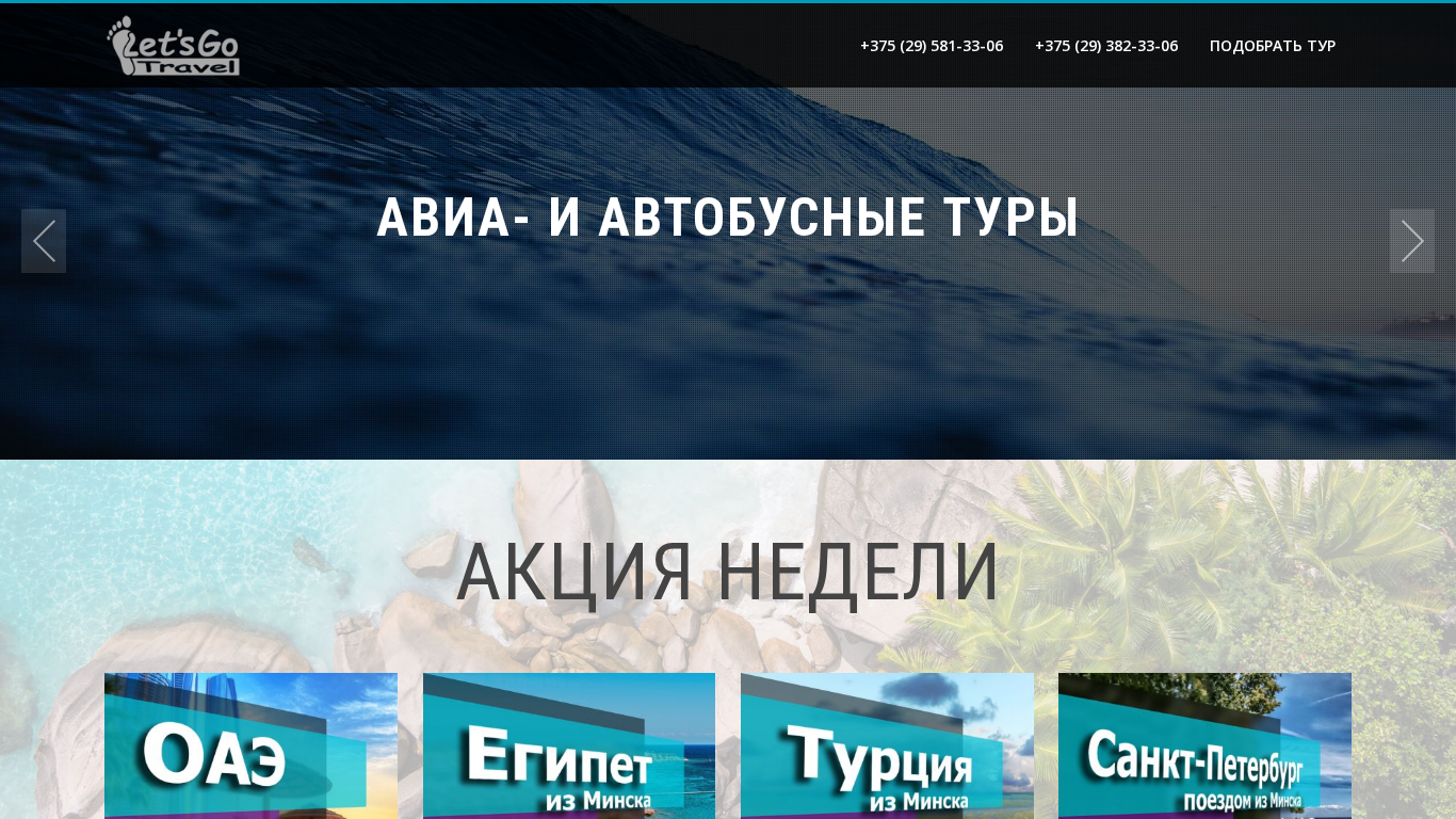 | AI-анализ | The web project Let'sGoTravel – Туристическая компания is a travel agency based in Minsk, Belarus. The site offers both air and bus tours, with destinations including Egypt and the United Arab Emirates. Prices for the tours include fuel costs, and visitors can find deals on hot tours in the Middle East for as little as 378 dollars for 7 nights or 410 dollars for a weeklong trip to Egypt. The site also offers tours to Turkey, Saint Petersburg, and Poland, with visa assistance available. The company boasts quick and high-quality service, and positive customer reviews praise the agency for its efficient organization and individualized approach. Users can contact Let'sGoTravel via phone at +375 (29) 581-33-06 or +375 (29) 382- |