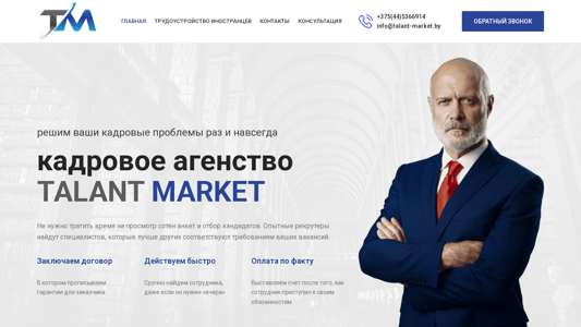 | Название / Заголовок | Кадровое агентство в Минске Talant Market: рекрутинговая компания по подбору персонала — Комплексные услуги по поиску сотрудников, подбору и найму квалифицированного персонала, а также кадровый HR аутсорсинг. |