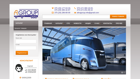 | AI-анализ | The website is for OOO «Альтра Груп», a company offering a wide range of parts for import and domestic heavy-duty trucks. Contact details include multiple phone numbers and an email address. The main sections of the site are Home, Catalog, Cargo Truck Parts, Diagnostic Equipment, and News. The Catalog section includes a list of various brands such as MAN, WABCO, Maz, Kamaz, Uaz, Gaz, Yamz, Zil, and many others. The site also offers diagnostic equipment and software. The company has been active on the market for some time and is well known for providing parts for a variety of heavy-duty trucks. |