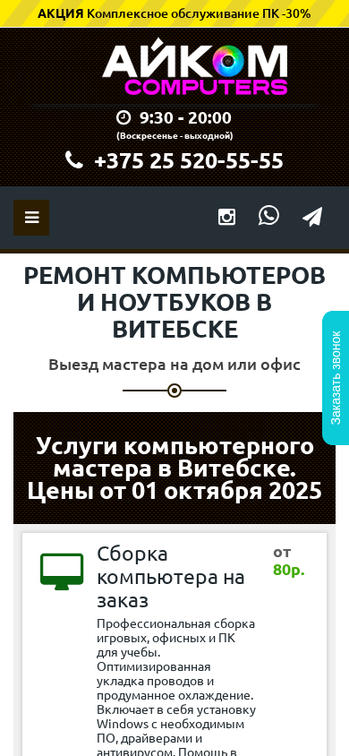 | SEO-описание | Тел: +375 25 520-55-55. Ремонт и техническое обслуживание компьютеров, ноутбуков в Витебске с выездом на дом или офис. Решение компьютерных проблем в день обращения. Самые низкие цены в городе. Гарантия на все виды работ. Мгновенный вызов мастера на дом или офис. Установка Windows любых версий, чистка от пыли, замена термопасты, ремонт любой сложности. Бесплатная диагностика при дальнейшем ремонте у нас. |