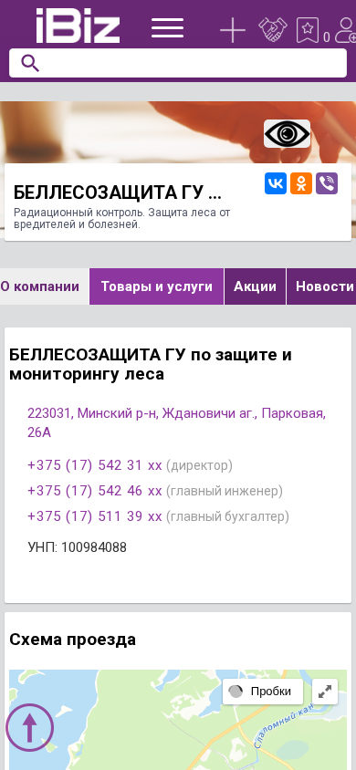 | Название / Заголовок | БЕЛЛЕСОЗАЩИТА ГУ по защите и мониторингу леса - Радиационный контроль. Защита леса от вредителей и болезней.. 223031, , Ждановичи аг., Парковая, 26А |