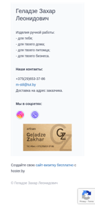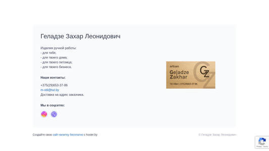 | AI-анализ | This website belongs to Zahar Leanidovich Geladze and offers handmade items for various purposes: for personal use, for home, for pets, and for businesses. The contact information includes a phone number and an email address for inquiries. Delivery is available to the buyer's address. The website also has social media presence and an option to create a free website with hoster.by. The form on the page requires users to fill in their name, email address, and message to submit a query. |