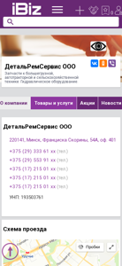 | AI-анализ | The website is a business platform for DetalRemServis OOO, a company based in Minsk, Belarus. The main focus of the site is the sale of spare parts for heavy machinery, automotive vehicles, and agricultural equipment, as well as hydraulic equipment. The address and contact information for the company, including multiple phone numbers, are provided. The site also includes a map for visitors to find the location. The platform offers various categories and sections, including new announcements, company information, and contact details. Users can add the company to their favorites and view statistics on the number of visitors and page views. The company's operating hours are listed as Monday through Friday, 9:00 AM to 6:00 PM, with weekends being closed. The site is part of the Ibiz.by business directory for Belarus. |