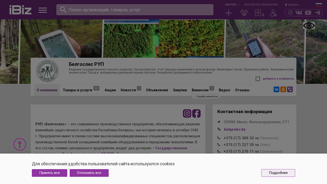 | Название / Заголовок | Белгослес РУП - Ведение государственного лесного кадастра. Лесоустройство. Учет текущих изменений в лесном фонде. Мониторинг лесов. Проектные работы. Агрохимический анализ почв. Отвод и материально-денежная оценка лесосек. Разработка программного обеспечения.. 220089, Минск, , Железнодорожная, 27/1 |