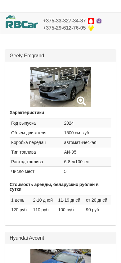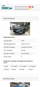 | AI-анализ | --- This online resource, titled "RBCar: Прокат авто в Минске!", is a car rental platform based in Minsk, Belarus. The website offers information on various car models for rent, including their characteristics such as year of release, engine size, transmission type, fuel type, and seating capacity. Each car model has a different rental price based on the duration of the rental period, with discounts available for longer rentals. The following cars are listed on the website with their respective details: 1. Geely Emgrand (2024, 1500 cc engine, automatic transmission, gasoline, 5 seats, 120-110-100-90 Belarusian rubles per day for 1-20 days) 2. Hyundai Accent (2018, 16 |
