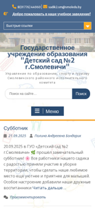 | AI-анализ | The web project "Государственное уchreждение образования "Детский сад №2 г.Смолевичи" – Управление по образованию, спорту и туризму Смолевичского районного испоlitativnoj komitet" (State Educational Institution "Childcare Centre No.2 of Smolevichi City" – Management of Education, Sports and Tourism of Smolevichy District Executive Committee) is a government educational establishment located in Smolevichi, Belarus. The website provides information about the kindergarten, its goals, staff, and regulations. Keywords related to education, Smolevichi city, kindergarten, and administrative procedures dominate the text. The site includes sections on the rules for pedagogical workers, adaptation of children to the learning process, and administrative procedures for safety. The institution's |