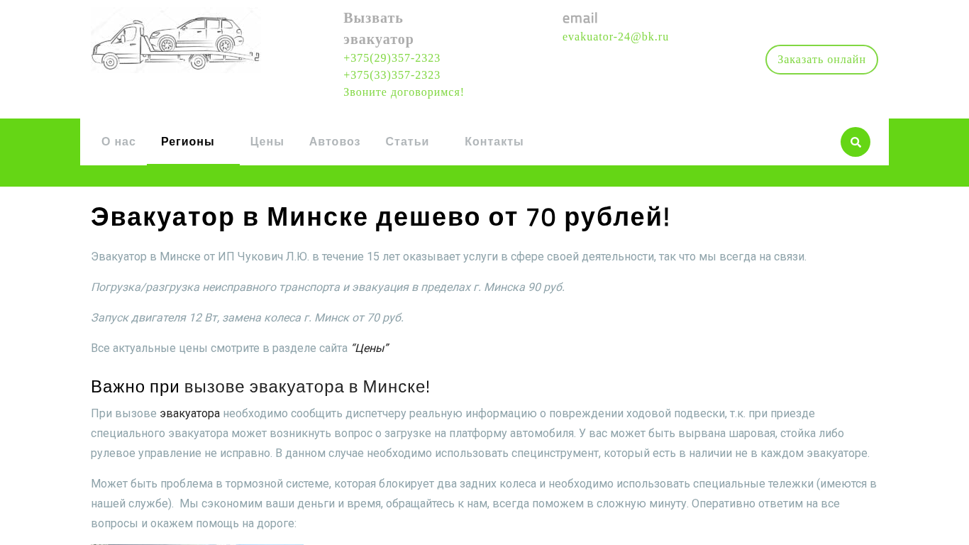 | SEO-описание | Эвакуатор в Минске по дешевым ценам круглосуточно. Вызвать автопомощь от 70 руб. быстро: ☎️ 357-23-23 (А1 и МТС)➤Услуги эвакуатора с подачей от 15 мин, 24/7. |