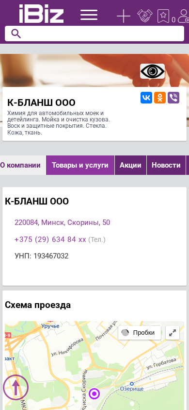 | Название / Заголовок | К-БЛАНШ ООО - Химия для автомобильных моек и детейлинга. Мойка и очистка кузова. Воск и защитные покрытия. Стекла. Кожа, ткань. . 220084, Минск, , Скорины, 50 |