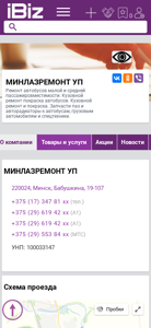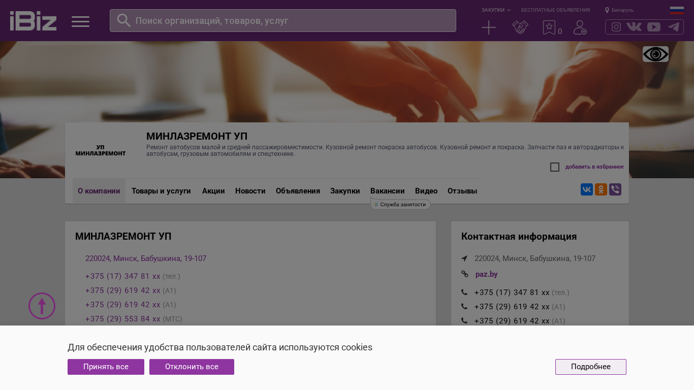 | Название / Заголовок | МИНЛАЗРЕМОНТ УП - Ремонт автобусов малой и средней пассажировместимости. Кузовной ремонт покраска автобусов. Кузовной ремонт и покраска. Запчасти паз и авторадиаторы к автобусам, грузовым автомобилям и спецтехнике. . 220024, Минск, , Бабушкина, 19-107 |