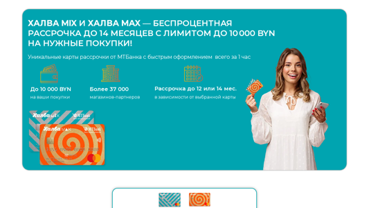 | SEO-описание | Оформите карту рассрочки Халва MIX или Халва MAX: пользуйся беспроцентной рассрочкой до 14 месяцев, лимит до 10 000 BYN, более 37 000 магазинов-партеров, оплата коммунальных платежей. |