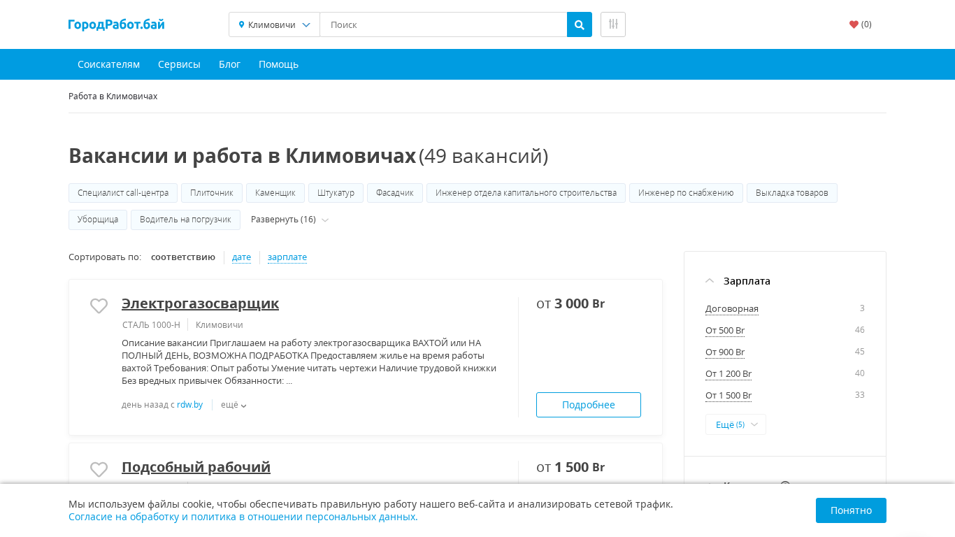 | SEO-описание | Ищете работу в Климовичах (Могилёвская область)? На нашем сайте Вы найдете более 49 свежих вакансий от прямых работодателей. Быстрый и удобный поиск вакансий с ГородРабот.бай |
