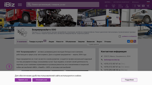 | AI-анализ | --- This website belongs to BelrempromAuto OOO, a company based in Minsk, Belarus, offering full repair services for commercial vehicles, buses, and microbuses, including engine repair, autoelectrics, bodywork, and spray painting. The company also provides welding work. The address and contact information for BelrempromAuto OOO are provided on the website. The company was founded in April 2004 and has since expanded its professional workforce and range of services. Initially, BelrempromAuto OOO focused on bodywork repair and painting for MAZ, KAMAZ, ZIL, and light passenger vehicles. Today, the company offers bodywork, welding, and painting services for all types of automotive technology, both domestic and imported, including heavy-duty and light commercial vehicles, buses, and microbuses. All services come with a six |
