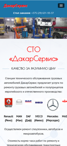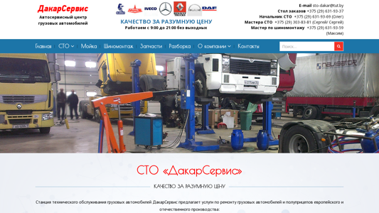 | AI-анализ | --- The portal dakarservis.by is an auto service center specialized in the repair of heavy-duty commercial vehicles in Minsk, Belarus. With a focus on quality and affordability, the company operates from 9:00 AM to 9:00 PM without weekends. Services offered include diagnostics, repair of computerized electro-equipment, braking systems, suspensions, heaters from Eberspächer and Webasto, engine and transmission repair, reductors, wheel alignment, and repairs on semitrailers, trailers, and semi-trucks. The company also provides bodywork repairs, services for Iveco, DAF, MAN, Mercedes, Renault, and MAZ commercial vehicles, as well as fueling, air conditioning refills, car washing, and tire mounting. The company's contact information includes an order desk, |