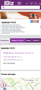 | Название / Заголовок | ЖАКОМ ЧТУП - Шины для малых тракторов и мотоблоков. Шины для вилочных погрузчиков. Сельскохозяйственные и индустриальные шины, камеры. Снегоотвалы для квадрациклов и вилочных погрузчиков. Цепи ГРМ для автомобилей. . 220088, Минск, , Смоленская, 15А, оф. 101 |