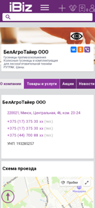 | AI-анализ | The portal belagrotaer.ibiz.by is a business-to-business (B2B) marketplace specializing in agricultural technology and forestry equipment. The company, BelAgroTayer OOO, offers anti-skid tracks, wheels, and components for forestry machinery from the brand RUTRACK. The website provides information on the company's products and services, contact details, and location. The domain uses the .BY top-level domain and is based in Belarus, with a specific address in Minsk. The website includes sections for news, announcements, vacancies, and customer reviews, as well as an interactive map for visitors to find the company's location. The company's offerings include automotive tires and rims for various transportation vehicles. The website is open for business from Monday to Friday, 9:00 AM to 6:00 |