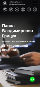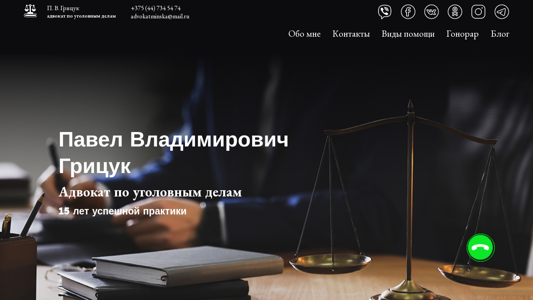 | AI-анализ | This website is a legal practice by advocate Paul Vladimirovich Gritsuk, specializing in criminal law cases in Belarus. The title of the website is "Advokat Gritsuk P.V." and the description includes keywords such as "criminal defense lawyer," "consultation of an attorney," "criminal defense attorney in Minsk," and various numbers representing different attorneys. The website offers help in criminal cases, protection of rights in court, and confidentiality. The attorney, Gritsuk, has over 15 years of experience and holds a license for practicing law in Belarus. He has a background in law enforcement, having served as an investigator from 2009 to 2012, and as a senior investigator from 2012 to 2014. Since 2014, he has provided legal assistance as |