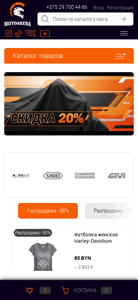 | AI-анализ | --- The website MoroArena is based in Minsk, Belarus, and specializes in selling motorcycles, parts, equipment, and accessories for motorcycles. The company offers motor technology from the USA, with options for purchasing motorcycles at favorable conditions and financing through the Halsva card. Customers can choose between self-pickup and delivery within Belarus. The website includes a catalog of various motorcycle brands, featuring categories such as helmets, clothing, maintenance, and accessories. Some items are available for discounts, and users can make a quick review or add items to their cart, wish list, or compare prices. Brands include Harley-Davidson, and product categories range from motorcycle parts, such as filters and belts, to accessories, like gloves and t-shirts. The website also offers services and commissions for the sale and maintenance of motorcycles. |