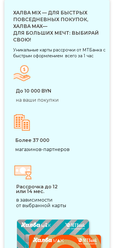 | Название / Заголовок | Карта рассрочки Халва MIX и Халва MAX – лимит до 10 000 BYN. |