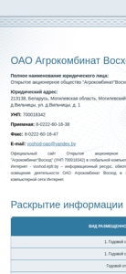 | Название / Заголовок | Агрокомбинат Восход ОАО |