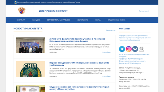 | AI-анализ | --- This online resource belongs to the Historical Faculty of Belarusian State Pedagogical University (BSPU), as indicated by the title "Historical Faculty BSPU - Main" and the description text mentioning "Белорусский государственный педагогический университет имени Максима Танка". The website provides information on the faculty, its departments, and academic programs. Keywords relate to the faculty, its history, and student-related terms. The top_words list includes phrases such as "the faculty", "dekanat", "history faculty", and "students", suggesting that the site is primarily focused on the educational aspects of the faculty. The site includes sections for the dean, history of the faculty, photo gallery, best graduates, and various academic departments. The domain name suggests that the site is operated by the Belarusian State Pedagog |