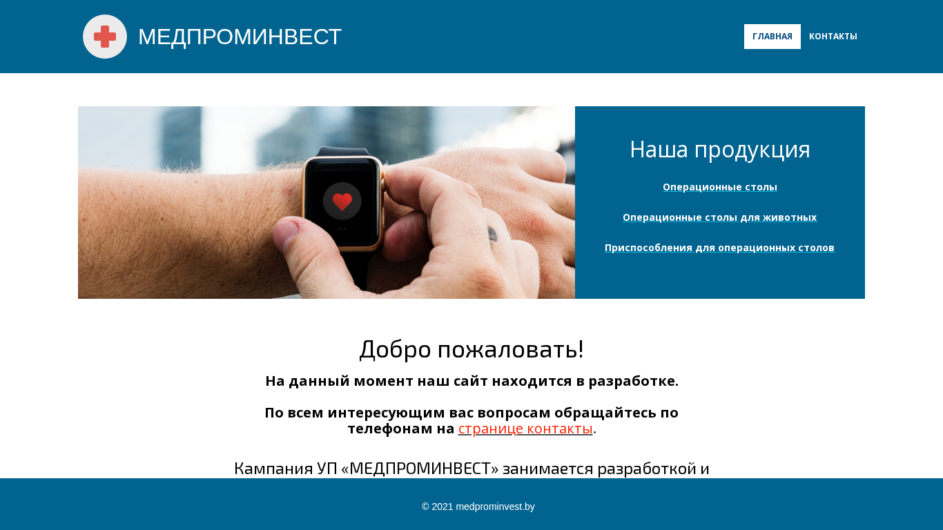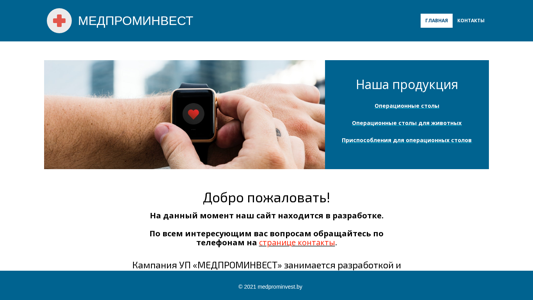 | AI-анализ | The web project "Medprominvest.by" is a site under development by the UP "Medprominvest" company, specializing in the design and manufacture of medical equipment. The homepage includes the main sections: "Home," "Contacts," "Our Production," "Operational Tables," "Operational Tables for Animals," and "Accessories for Operational Tables." The text mentions that the site is currently in the development stage and provides contact information for inquiries. Keywords associated with the project include "medical equipment," "operational tables," "animals," and "accessories." |