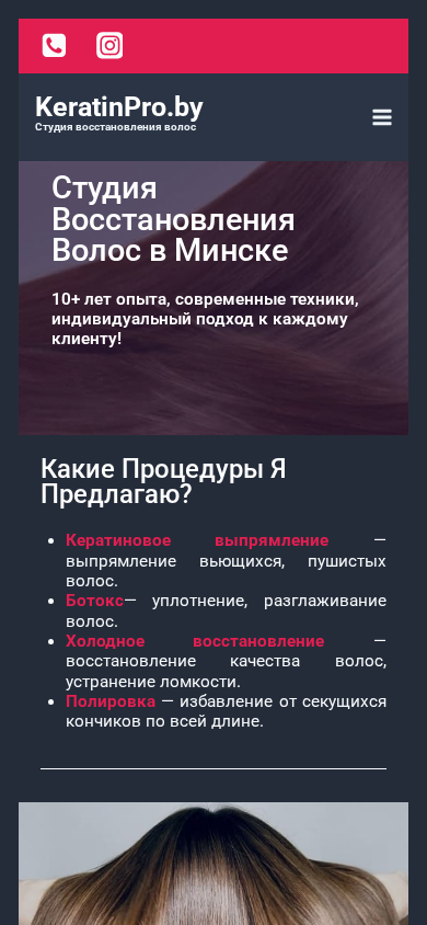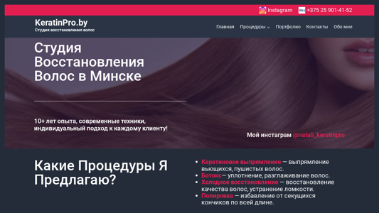 | AI-анализ | The web project "KeratinPro.by" is a hair restoration studio based in Minsk, Belarus. The website offers various hair restoration procedures including keratin treatment, cold restoration, botox, and polishing. The studio provides consultation and diagnosis services as well as education. The homepage includes links to Instagram, contact information, and a portfolio. The main procedures listed are keratin treatment, cold restoration, botox for hair, and polishing. The website also features a phone number, Instagram account, and a menu to open. The studio boasts over 10 years of experience in hair restoration and uses modern techniques with an individual approach to each client. The owner, Natasha, is a certified hair restoration specialist and has been in the business since 2015. She has undergone extensive training and keeps up with the latest hair restoration techniques and products. The website includes customer reviews and is located |