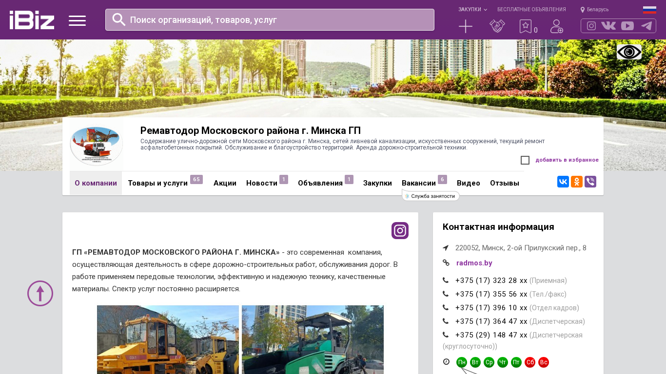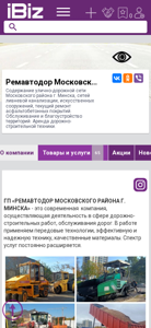 | AI-анализ | This online resource is the official website for the Remavtoador of Moscow District in the city of Minsk, Belarus. The organization provides services related to the maintenance and repair of urban road networks, sewage systems, artificial structures, and asphalt pavements in Moscow District of Minsk city. They also offer services for the maintenance and improvement of territories and the rental of construction equipment. The website includes a map for navigation, contact information, and the address of the company: 2-oy Priluksy per., 8, Minsk, 220052, Belarus. Services offered by the company include the rental of construction equipment, accepting and draining stormwater into the sewage system, the sale of asphalt granules, repair and construction works, providing space for snow storage, territory cleaning and improvement, fuel sales, vehicle washing, and tire |