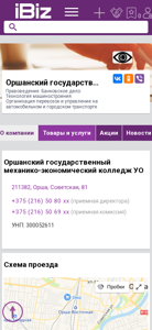 AI-анализ | The website is for Orshansky Gosudarstvenny Mehaniko-Economichesky Kollezh (Orshansky State Mechanical-Economic College) located at Sovietskaya 81, Orsha, 211382, Belarus. The college offers programs in law, banking, technology of machinery production, and organization of transportation and management on automobile and city transport. Contact information including phone numbers are provided, as well as a map scheme for visiting the college. The website also includes sections for news, announcements, job vacancies, and statistics. |