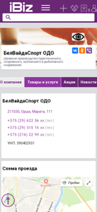 | AI-анализ | This website is for BelVaidasport ODO, a manufacturing company based in Orsha, Belarus, producing touristical, sports, hunting, and fishing equipment. The website provides contact information including phone numbers and an address. The company's UNP number is 390402931. The website offers a map for directions and business hours are Monday to Friday from 9:00am to 6:00pm without lunch. The website is categorized under 'Manufacturing' and specifically 'Light Industry' in the Ibiz.by business directory. The top words associated with the website are '375', 'тел', 'услуги', 'швейное', 'производство', 'закупки', 'объявления', 'без', and 'обеда'. |