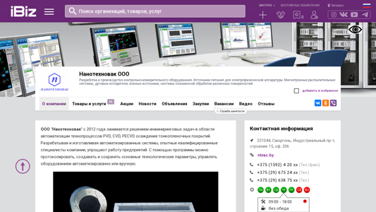 | AI-анализ | The web project "Nanotechnavk OOO" is a Belarusian company specializing in the research, development, and manufacturing of control-measuring equipment and power sources for electrophysical apparatuses. Their product range includes magnetron spraying systems, arc furnaces, ion sources, and plasma processing systems for various surfaces. The company is located in Smorgon, Belarus, at Industrial Park, building 15, office 206. The contact information and address are provided. |
