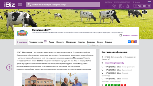 | AI-анализ | This website is for Michalishki Agricultural Productions, a Belarusian farm located in the Kirov district, specializing in the production and sale of both animal and plant products. The farm owns modern equipment, repair workshops, four grain storage facilities, livestock facilities, and a dairy complex. The farm covers 8557 hectares of agricultural land, with 4922 hectares for arable land and 3634 hectares for meadows. Michalishki Agricultural Productions offers competitive and high-quality products grown using advanced technologies. They sell milk, meat, rapeseed, grain, and sugar beets. The farm also features a cafe called "Vilia," which offers traditional Belarusian cuisine, spacious halls, and a VIP room with free Wi-Fi. It is an ideal location for organizing wed |